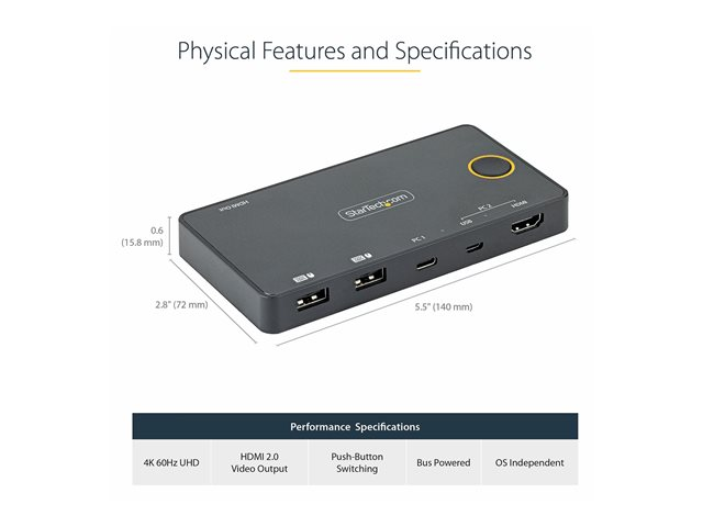 Enskild 4K 60 Hz HDMI 2.0-skärm - Kompakt HDMI KVM-switch för stationär/bärbar dator - USB-bussdriven - Thunderbolt 3-kompatibel - Omkopplare för tangentbord/video/mus/ljud - 2 x KVM/ljud - skrivbordsmodell